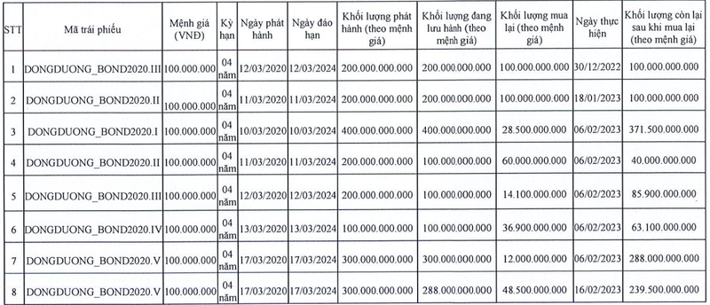 Số trái phiếu này nằm trong 5 lô trái phiếu có tổng giá trị 1.200 tỉ đồng (đều có kỳ hạn 4 năm, lãi suất kỳ thanh toán đầu tiên là 12%/năm) mà BĐS Đông Dương đã phát hành cách đây 3 năm, từ ngày 10/3 – 17/3/2020. Thương vụ được thu xếp bởi CTCP Chứng khoán HDB (HDBS).