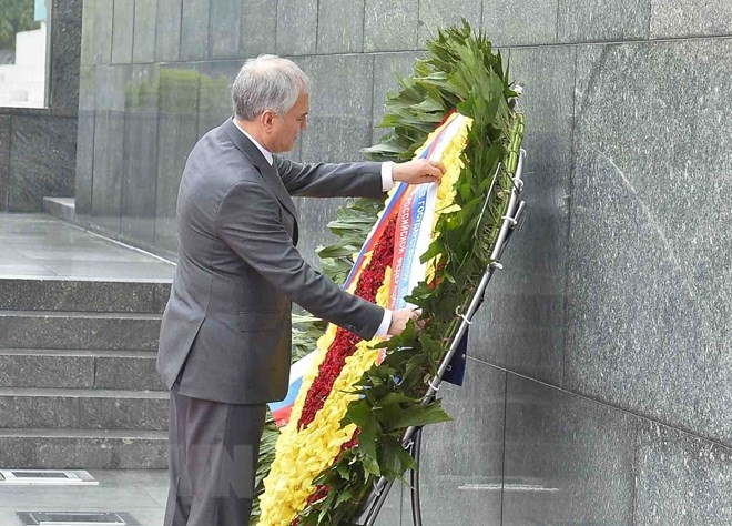 Trong khuôn khổ chuyến thăm chính thức Việt Nam, sáng cùng ngày, Chủ tịch Duma Quốc gia Quốc hội Liên bang Nga Vyacheslav Vichtorovich Volodin dẫn đầu Đoàn đại biểu cấp cao Liên bang Nga đã đến đặt vòng hoa và vào Lăng viếng Chủ tịch Hồ Chí Minh; đặt vòng hoa tưởng niệm các Anh hùng liệt sỹ tại Đài tưởng niệm các Anh hùng liệt sỹ trên đường Bắc Sơn (Ba Đình, Hà Nội)./.