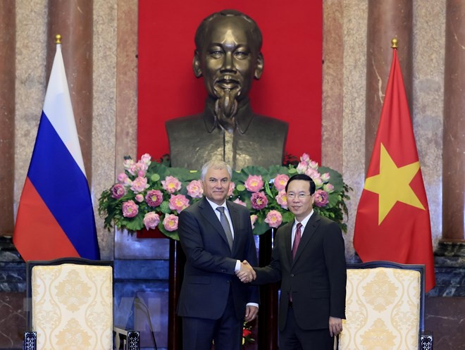 Chủ tịch nước Võ Văn Thưởng tiếp Chủ tịch Duma Quốc gia NgaVyacheslav Viktorovich Volodin. (Ảnh: Thống Nhất/TTXVN)