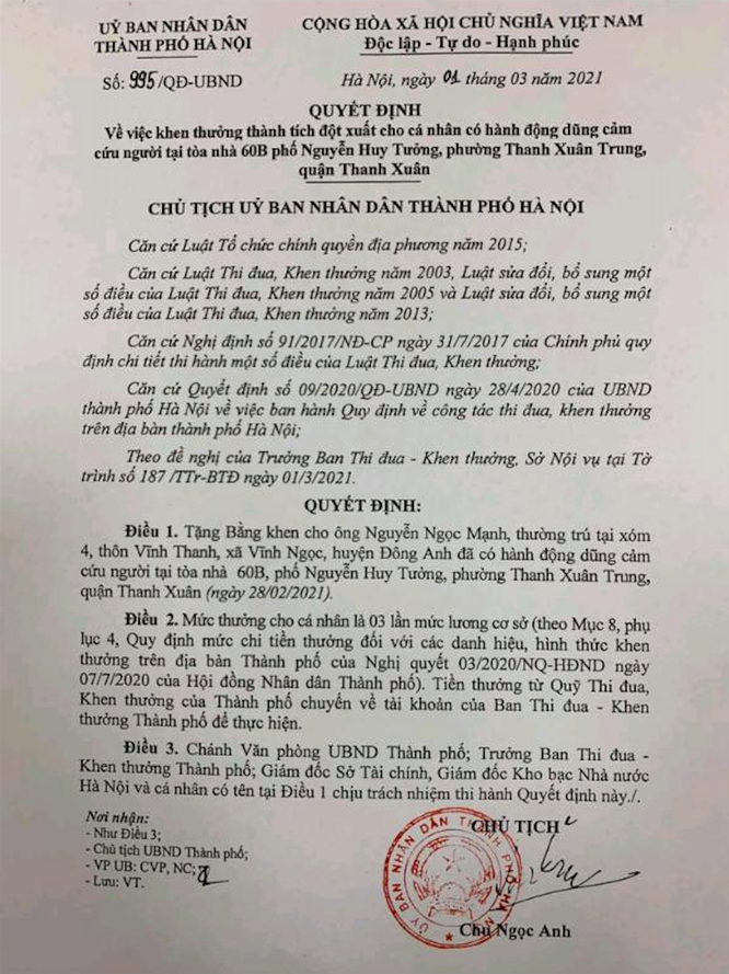 Đây là nội dung chính trong quyết định về việc khen thưởng thành tích đột xuất cho cá nhân có hành động dũng cảm cứu người tại tòa nhà 60B Nguyễn Huy Tưởng, phường Thanh Xuân Trung, quận Thanh Xuân do ông Chu Ngọc Anh – Chủ tịch UBND TP. Hà Nội ký.