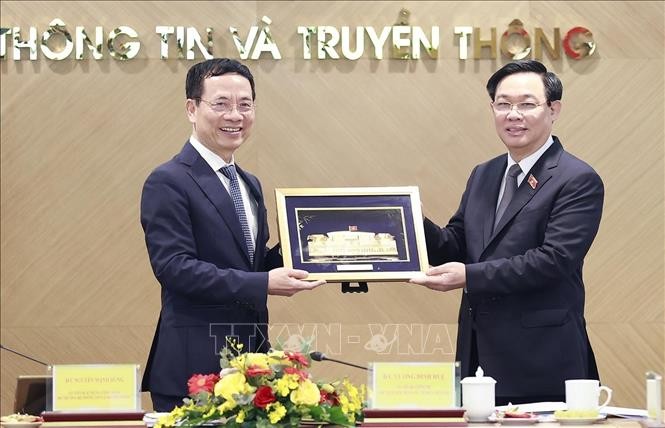 Chủ tịch Quốc hội Vương Đình Huệ tặng bức tranh 3D biểu tượng Nhà Quốc hội cho Bộ Thông tin và Truyền thông. Ảnh: Doãn Tấn/TTXVN