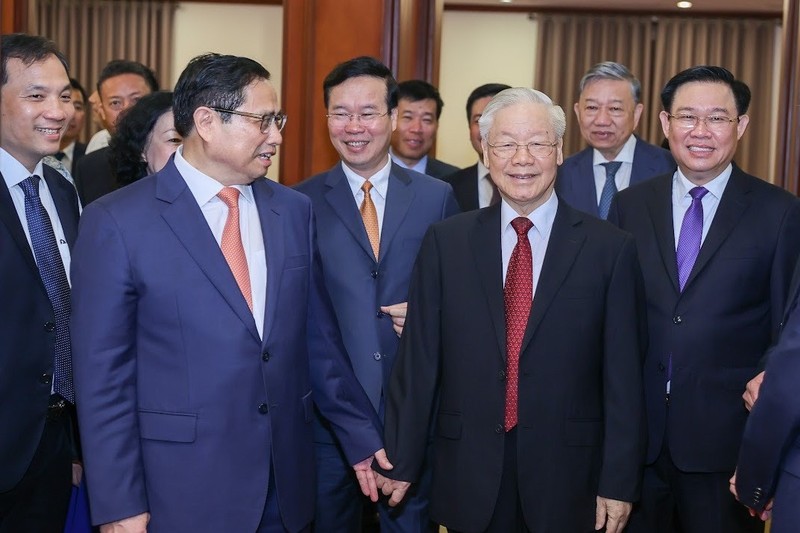 Thủ tướng Phạm Minh Chính, Thường trực Ban Bí thư, Trưởng Ban Tổ chức Trung ương Trương Thị Mai, Phó Thủ tướng Trần Lưu Quang và các đại biểu tại phiên bế mạc Hội nghị Trung ương 7 - Ảnh: VGP/Nhật Bắc