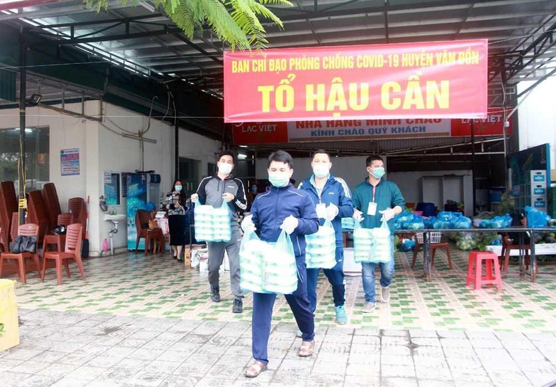 Để đảm bảo cung cấp các suất ăn hàng ngày cho những người cách ly, huyện Vân Đồn đã trưng dụng Nhà hàng Minh Châu (thị trấn Cái Rồng) và gần 30 cán bộ, giáo viên ở các trường học cùng nhân viên Nhà hàng Minh Châu để thành lập Tổ hậu cần, phục vụ nấu ăn, cung cấp đến các khu cách ly tập trung và các điểm chốt kiểm soát dịch ra vào địa bàn huyện Vân Đồn.