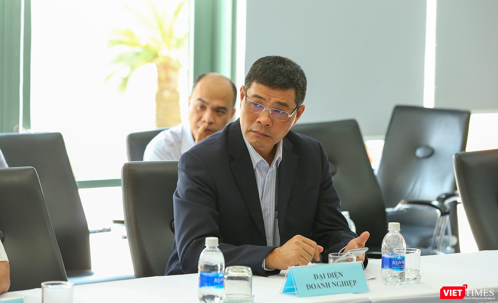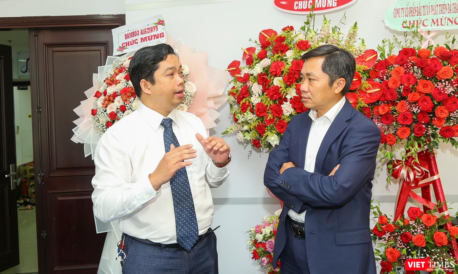 Ông Nguyễn Minh Hồng - Chủ tịch Hội truyền thông số (bìa phải), thảo luận cùng Phó Chủ tịch UBND TP Đà Nẵng Lê Quang Nam