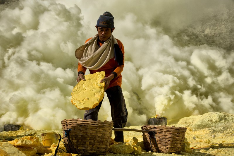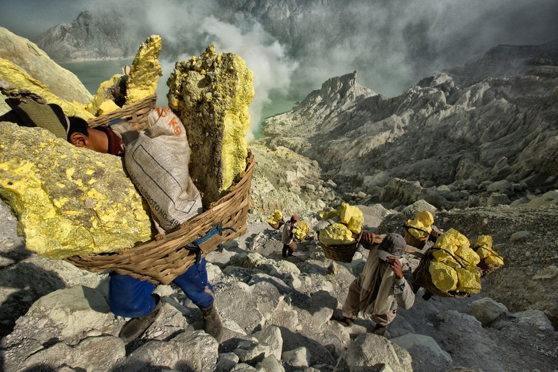 1. Thợ mỏ lưu huỳnh ở Indonesia làm việc bên trong một ngọn núi lửa còn hoạt động, họ phải vác theo 70 kg lưu huỳnh đi 2.5 km ra khỏi núi lửa, và sau đó hơn 3 km xuống núi đến một trạm cân.