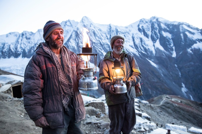Trong bức ảnh này, một nhà cung cấp thịt mang dê lên cho các thợ mỏ đá quý. Bởi vì độ cao, tất cả các vật tư và thiết bị phải được đưa vào từ các làng và thung lũng bên dưới.