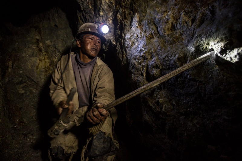 "Công việc ở đây cực kỳ nguy hiểm. Ngay cả những cái chết cũng rất phổ biến. Khi tôi ở đó, khoảng ba đến năm thợ mỏ chết mỗi tháng. Những người mà tôi đã nói chuyện cùng đều đã mất đi các thành viên gia đình hoặc bạn bè cùng làm việc trên ngọn núi đó," Brown nói. "Tất cả mọi người, chẳng chừa một ai." Trong bức ảnh này là một thợ mỏ đang đục lỗ bằng chất nổ đinamit.
