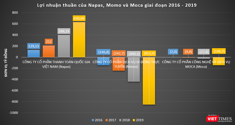 Lĩnh vực thanh toán điện tử tiềm năng là vậy, song, không phải đơn vị trung gian thanh toán nào cũng có kết quả kinh doanh khả quan. Dữ liệu của VietTimes cho thấy, Napas là đơn vị hiếm hoi có lãi trong 4 năm gần nhất, kết quả kinh doanh “sáng” hơn nhiều so với các ví điện tử Momo, ZaloPay hay Moca.