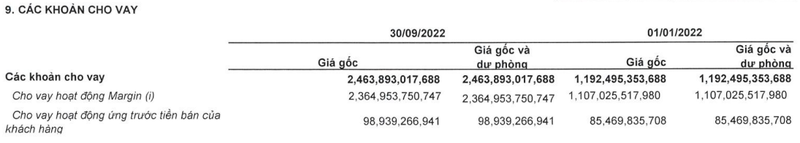 Trong đó, cho vay hoạt động margin là 2.364,9 tỉ đồng; cho vay hoạt động ứng trước tiền bán của khách hàng là 98,9 tỉ đồng.