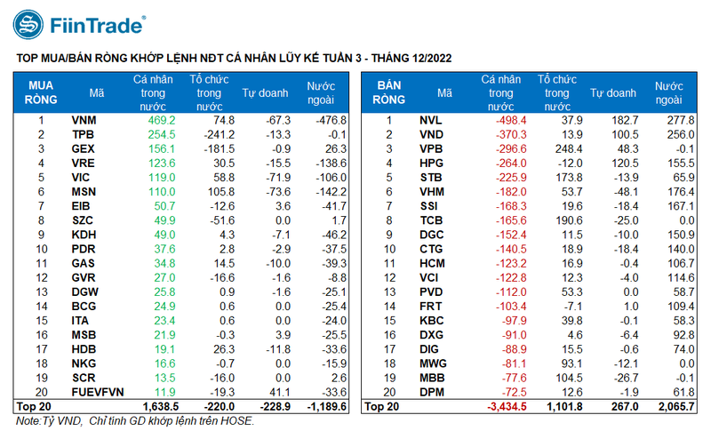Trong tuần giao dịch 12 – 16/12, nhà đầu tư cá nhân tiếp tục bán ròng 2.166 tỉ đồng trên HOSE. Tính riêng giao dịch khớp lệnh họ bán ròng 2.938 tỉ đồng, tập trung vào các mã NVL (-498,4 tỉ đồng), VND (-370,3 tỉ đồng), VPB (-296,6 tỉ đồng), HPG (-264 tỉ đồng), STB (-225,9 tỉ đồng).