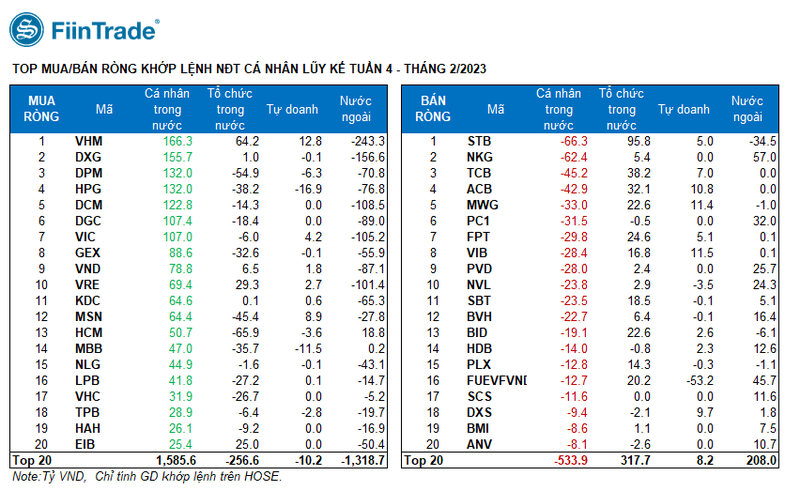 Ngược lại, nhà đầu tư cá nhân bán ròng khớp lệnh nhiều nhất là STB (-66,3 tỉ đồng), NKG (-62,4 tỉ đồng), TCB (-45,2 tỉ đồng), ACB (-42,9 tỉ đồng), MWG (-33 tỉ đồng).