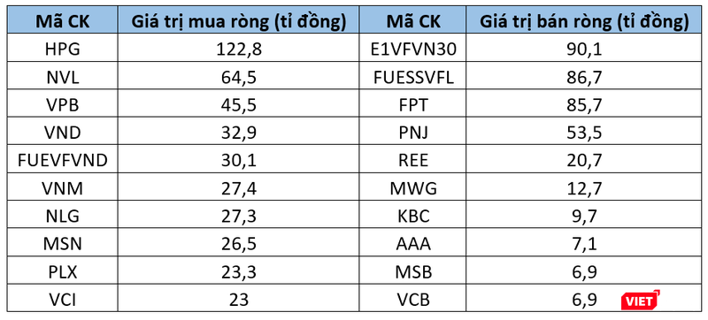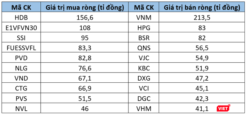 Trong đó, HDB là cổ phiếu được gom mạnh nhất với giá trị mua ròng đạt 156,6 tỉ đồng. Theo sau là E1VFVN30 (108 tỉ đồng), SSI (95 tỉ đồng), FUESSVFL (83,3 tỉ đồng) và PVD (82,8 tỉ đồng).