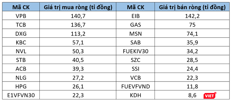 Ở chiều hướng ngược lại, các nhà đầu tư nước ngoài xả mạnh HPG (352,1 tỉ đồng), NVL (308 tỉ đồng), BSR (197 tỉ đồng), DGC (81,5 tỉ đồng) và ACV (61,4 tỉ đồng).