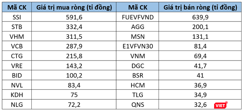 SSI là cổ phiếu được khối ngoại mua ròng nhiều nhất với giá trị đạt 591,6 tỉ đồng. Đáng chú ý, các nhà đầu tư nước ngoài mua ròng SSI phiên thứ 13 liên tiếp với tổng giá trị là 974 tỉ đồng.