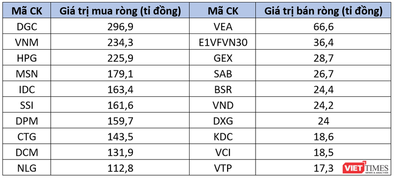 DGC là cổ phiếu được khối ngoại mua ròng nhiều nhất với tổng giá trị mua ròng 296,9 tỉ đồng. Tiếp đến là các mã VNM (234,3 tỉ đồng), HPG (225,9 tỉ đồng), MSN (179,1 tỉ đồng), IDC (163,4 tỉ đồng) và SSI (161,6 tỉ đồng).