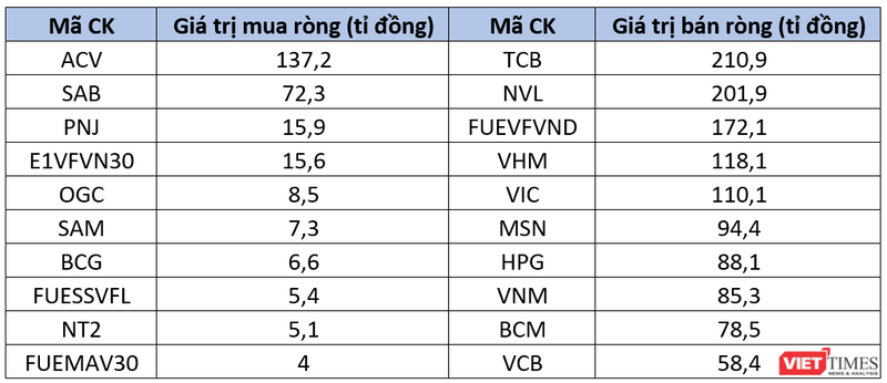 Ở chiều ngược lại, khối ngoại tập trung bán ròng VEA (66,6 tỉ đồng), E1VFVN30 (36,4 tỉ đồng), GEX (28,7 tỉ đồng), SAB (26,7 tỉ đồng), BSR (24,4 tỉ đồng).