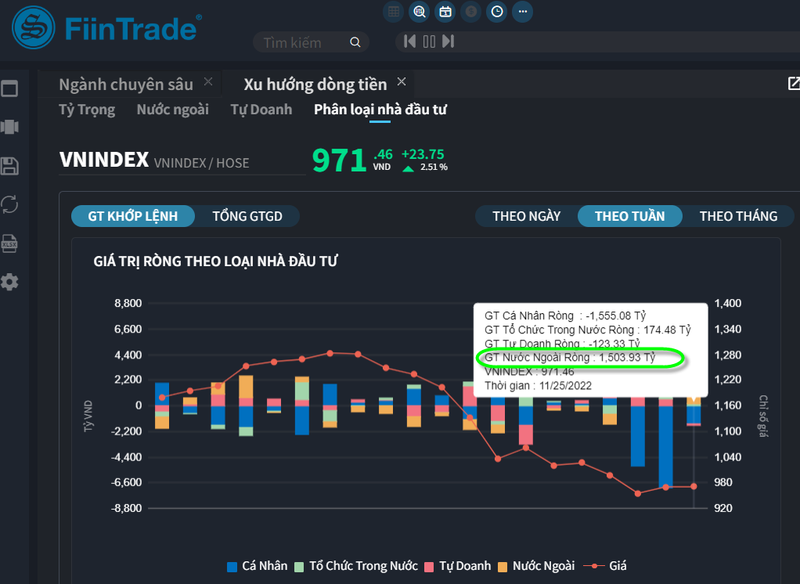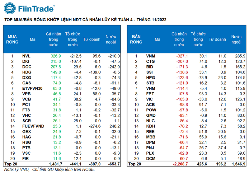 Trong tuần từ 21/11 – 25/11, nhà đầu tư cá nhân tiếp tục bán ròng với giá trị 1.697 tỉ đồng trên HOSE. Tính riêng giao dịch khớp lệnh họ bán ròng 1.555 tỉ đồng, tập trung vào các mã VNM (-327,1 tỉ đồng), CTG (-207 tỉ đồng), BID (-171,3 tỉ đồng), SSI (-138,6 tỉ đồng), HPG (-123,6 tỉ đồng).