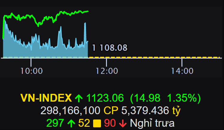 Kết thúc phiên sáng, chỉ số VN-Index tăng 14,98 điểm (+1,35%) lên 1.123,06 điểm. Tương tự, chỉ số HNX-Index tăng 2,58 điểm (+1,17%) lên 222,45 điểm. Số mã tăng trên sàn HOSE chiếm áp đảo với 297 mã tăng điểm.