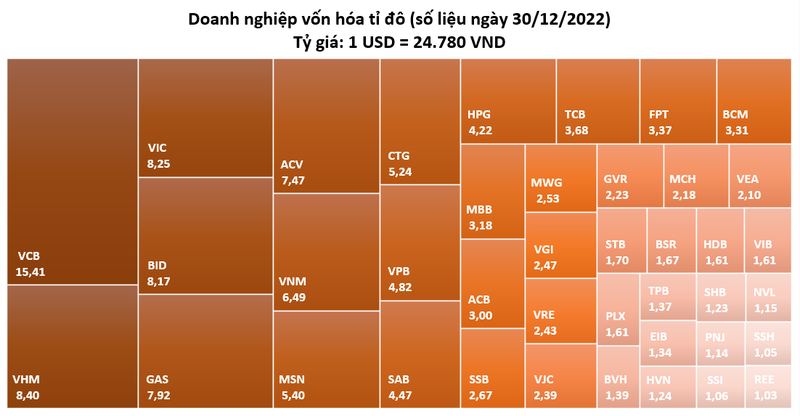 Trong đó, có tổng cộng 40 doanh nghiệp ghi nhận vốn hóa trên 1 tỉ USD (trên 24.780 tỉ đồng – theo tỷ giá tham khảo tại Sở giao dịch NHNN ngày 30/12 là 24.780 đổi 1 USD), giảm 24 doanh nghiệp so với thời điểm đầu tháng 4/2022.