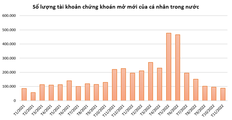 Lũy kế 11 tháng đầu năm, nhà đầu tư cá nhân trong nước mở mới hơn 2,48 triệu tài khoản, gấp 2,58 lần so với cuối năm trước.