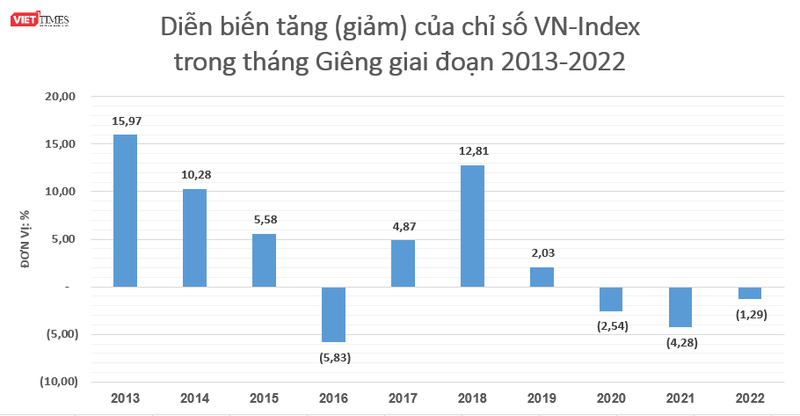Trong giai đoạn từ năm 2013 - 2022, chỉ số VN-Index có tới 6/10 năm tăng điểm. Mức tăng cao nhất là vào tháng 1/2013 khi chỉ số VN-Index bật tăng tới 15,97%.