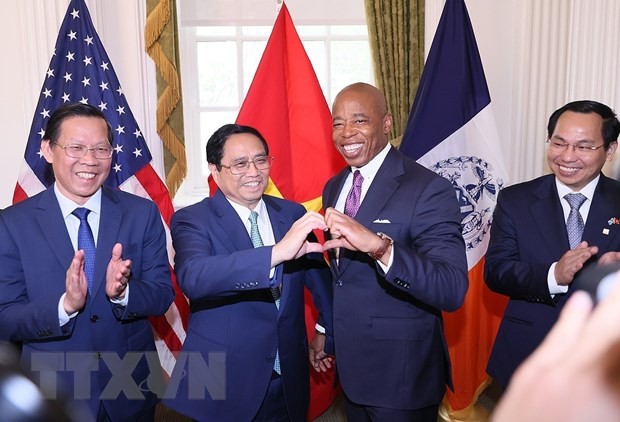 Thủ tướng Phạm Minh Chính và Thị trưởng New York Eric Adams. (Ảnh: Dương Giang/TTXVN)