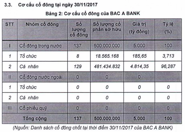 Bản cáo bạch niêm yết cho thấy Bac A Bank có quy mô vốn là 5.000 tỷ đồng nhưng chỉ ghi nhận 137 cổ đông (đều là cổ đông trong nước) đang “đồng hành” cùng ngân hàng theo danh sách chốt ngày 30/11/2017.