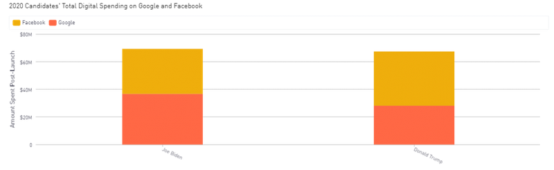Trong chặng nước rút của cuộc đua bầu cử Mỹ 2020, cả hai chiến dịch tranh cử đều đang chi tiêu rất nhiều vào các nền tảng số, như Facebook và Google để tiếp cận dễ dàng nhất và kỳ vọng qua đó có thể nhắn gửi những hứa hẹn cuối cùng tới các cử tri. Chiến dịch tranh cử của Tổng thống Donald Trump đang chiếm lợi thế về tổng chi tiêu cho quảng cáo Facebook và Google, nhưng chiến dịch của cựu Tổng thống Joe Biden cũng bám đuổi sát nút và cho thấy không hề kém cạnh với số tiền mà phía đương kim Tổng thống đã bỏ ra, trong 60 ngày qua.