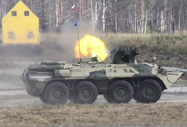 Video ghi lại hoạt động của xe BTR-82А. Xe thiết giáp có hình dáng bên ngoài khá giống với xe BTR-60PB, nhưng có khả năng hoạt động tốt hơn, được trang bị đài thông tin hoàn toàn mới, hệ thống kính quan sát trưởng xe tổng hợp. Xe lắp đặt tháp pháo dạng mô đun, có thể sử dụng nhiều loại vũ khí trang bị khác nhau tùy theo yêu cầu nhiệm vụ, điều khiển từ xa và hệ thống ổn định tầm hướng cho vũ khí trang bị.