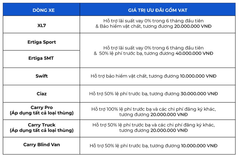 Bên cạnh đó, Việt Nam Suzuki cũng đang áp dụng chương trình khuyến mãi dành cho tất cả các dòng xe trong tháng 11. Ciaz mới sẽ được hỗ trợ 50% lệ phí trước bạ, tương đương 30 triệu VND. Chi tiết cụ thể:
