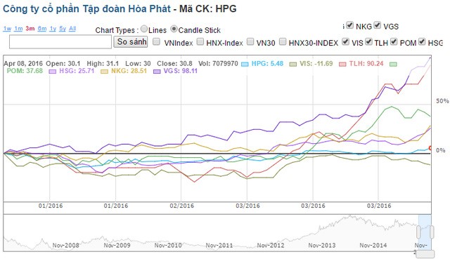 Trong khi cổ phiếu nhiều doanh nghiệp thép âm thầm tăng giá mạnh thời gian qua thì, HPG của Tập đoàn Hòa Phát, vốn nổi danh trên thị trường chứng khoán với nhiều cuộc gặp mặt nhà đầu tư, những thông tin tới tấp trên thị trường, với uy danh của doanh nghiệp tốp đầu ngành, vốn trên 7.300 tỷ lại gần như không tăng trưởng. Cổ phiếu HPG cũng có sóng nhưng nhỏ hơn nhiều so với các cổ phiếu khác trong ngành. Đầu năm 2016, giá cổ phiếu HPG ở mức ~29.000 đồng thì thời điểm hiện tại cũng chỉ mới 31-32.000 đồng/cổ phiếu. Mặc cho doanh thu cao ngút hơn 28 nghìn tỷ, mặc cho lợi nhuận năm 2015 đầy doanh nghiệp mơ ước với gần 3,5 nghìn tỷ, cổ đông Hòa Phát vẫn mỏi mắt ngóng chờ cổ phiếu tăng giá mà chẳng biết bao giờ tăng. Hay vì quyết định dấn thân nông nghiệp mà đại gia khác cũng đang đau đầu đã khiến nhà đầu tư chưa thể nói có đua tranh để giành quyền sở hữu cổ phiếu này.