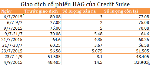 Ngay sau đó, tổ chức này lại thực hiện hàng loạt các giao dịch khác, bán ra mỗi lần 2 triệu, 5 triệu, 5,48 triệu...cổ phiếu HAG. Chỉ tính riêng trong tháng 7, Credit Suise đã bán ra tổng cộng hơn 28,5 triệu cổ phiếu HAG, làm giảm tỷ lệ nắm giữ từ 10,14% xuống còn 6,52% vốn điều lệ HAG.