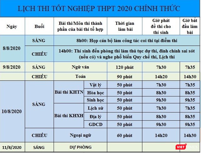 Trước đó, theo thông tin từ Bộ GD&ĐT, kỳ thi tốt nghiệp THPT năm 2020 sẽ chính thức diễn ra trong 2 ngày từ 9/8 đến 10/8. Ngày 8/8, thí sinh làm thủ tục dự thi.