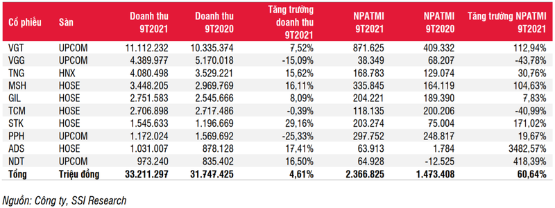 Trong khi đó, các công ty dệt may lại công bố kết quả kinh doanh trái chiều. Cụ thể, các công ty có trụ sở tại miền Bắc, như CTCP Đầu tư và Thương mại TNG (Mã CK: TNG) và CTCP May Sông Hồng (Mã CK: MSH), không bị ảnh hưởng bởi các biện pháp giãn cách xã hội trong quý 3/2021, đã công bố mức tăng trưởng lợi nhuận sau thuế lần lượt là 31% và 105% so với cùng kỳ.