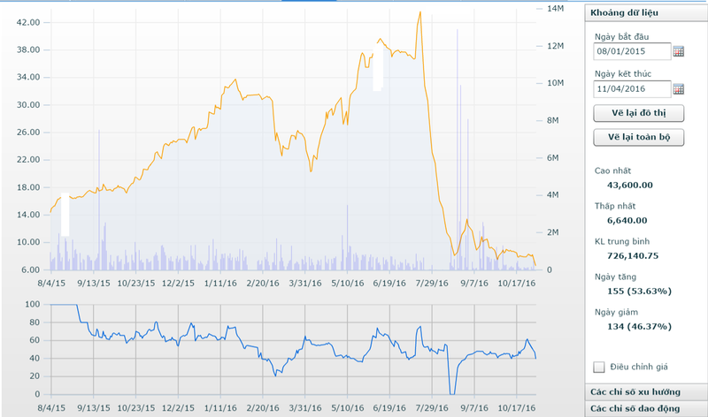 Chốt phiên gần nhất (4/11/2016), TTF đứng ở 6.640 đồng/ cổ phiếu – cũng là mức đáy thấp nhất của mã chứng khoán này kể từ ngày lên sàn.