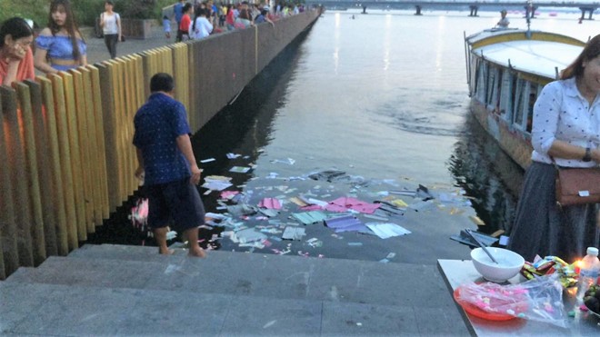 Sau khi cúng bái, một số người đã ném vàng mã xuống sông Hương gây ô nhiễm môi trường