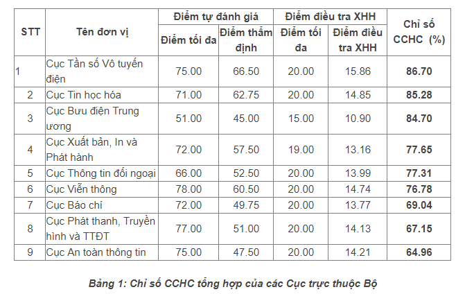 Trong đó, Chỉ số CCHC tổng hợp chia làm 2 nhóm xếp hạng: Nhóm 1 – Chỉ số CCHC tổng hợp của các Cục trực thuộc Bộ, đứng đầu là Cục Tần số Vô tuyến điện với chỉ số CCHC là 86,7%, tiếp đến là Cục Tin học Hóa với chỉ số CCHC 85,28% (tăng 4,54% so với năm 2016) và đơn vị có điểm số tăng đáng kể nhất là Cục Bưu điện Trung ương với chỉ số CCHC 84,7% ( tăng 10,78% so với năm 2016, và dịch chuyển vị trí xếp hàng từ thứ 5 lên thứ 3).