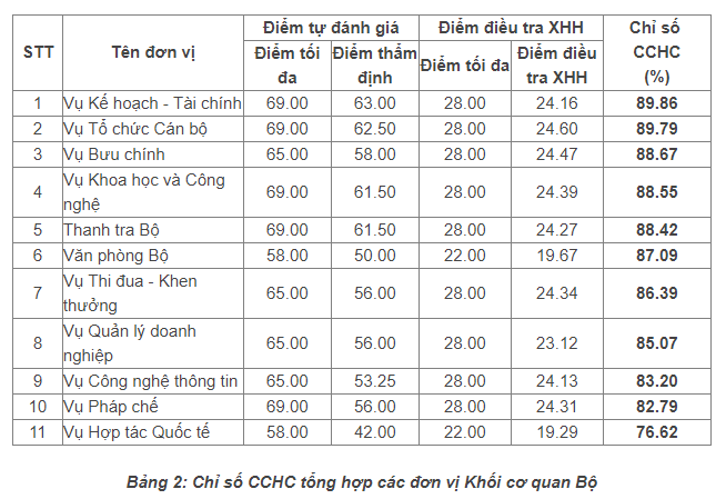 Nhóm 2 – Chỉ số CCHC tổng hợp của các đơn vị khối cơ quan Bộ, đứng đầu là Vụ Kế hoạch – Tài chính với chỉ số CCHC là 88,39%, tiếp đến lần lượt là Vụ Tổ chức Cán bộ, Vụ Bưu chính, Vụ Khoa học – Công nghệ, Thanh tra Bộ, Văn phòng Bộ, Vụ Thi đua – Khen thưởng, Vụ Quản lý doanh nghiệp, Vụ Công nghệ Thông tin, Vụ Pháp chế, Vụ Hợp tác Quốc tế.