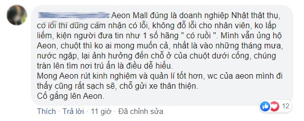 Hôm qua, Aeon Mall Việt Nam đã lên tiếng xin lỗi về vụ việc. Đại diện Aeon Mall xác nhận chuột đã bò lên khay thức ăn của quầy Ẩm thực Việt, khu Delica. Khu này đang trong giai đoạn sửa chữa và quầy ẩm thực Việt đã tạm đóng cửa chờ cho đến khi việc thi công hoàn tất. Aeon Mall Tân Phú cũng đang rà soát lại toàn bộ các tủ quầy trong khu Delica, vệ sinh khay thức ăn, dụng cụ chế biến và sàn nhà để đảm bảo thực phẩm chế biến được bảo quản sạch sẽ, vệ sinh.
