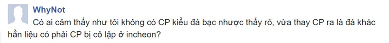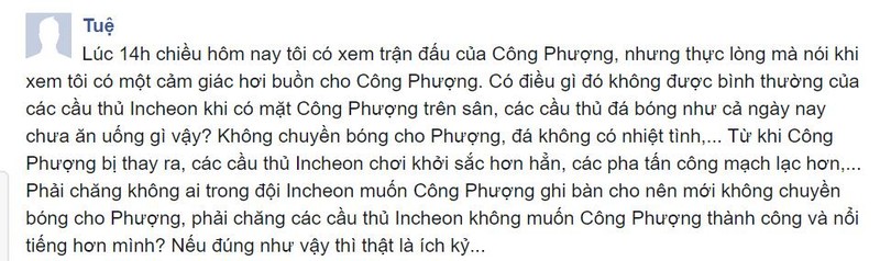 Ngay sau khi trận đấu kết thúc, rất nhiều người hâm mộ Việt Nam đã tỏ ra nghi ngờ rằng Công Phượng đang bị các đồng đội cô lập. Một số cổ động viên giải thích rằng cầu thủ Hàn Quốc từ trước đến nay không đánh giá cao cầu thủ đến từ Đông Nam Á, nên họ không thoải mái chơi bóng với Công Phượng. Một số khác lại cho rằng chính việc các cổ động viên Việt Nam vào fanpage của CLB Incheon để tung hô Phượng như một ngôi sao khiến đồng đội của anh cảm thấy không hài lòng.