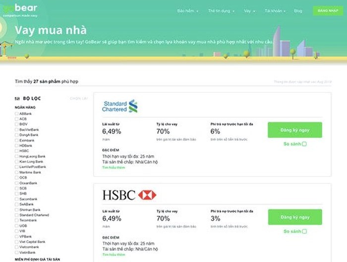 Với các sản phẩm so sánh Vay thế chấp mới vừa được Công ty công nghệ GoBear Việt Nam (GoBear Việt Nam) cho ra mắt, thời điểm hiện tại, người dùng GoBear Việt Nam đã có thể nhanh chóng so sánh sản phẩm vay thế chấp cho mục đích mua nhà, tiêu dùng cá nhân, và mua xe từ các ngân hàng thương mại đang hoạt động tại Việt Nam.