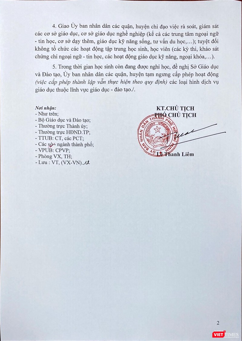 Ủy ban nhân dân TP.HCM cũng giao UBND các quận, huyện chỉ đạo việc rà soát, giám sát các cơ sở giáo dục, cơ sở giáo dục nghề nghiệp (kể cả các trung tâm ngoại ngữ - tin học, cơ sở dạy thêm, giáo dục kỹ năng sống, tư vấn du học…); tuyệt đối không tổ chức các hoạt động tập trung học sinh, học viên (các kỳ thi, khảo sát chứng chỉ ngoại ngữ, tin học, các hoạt động giáo dục kỹ năng, ngoại khóa…)