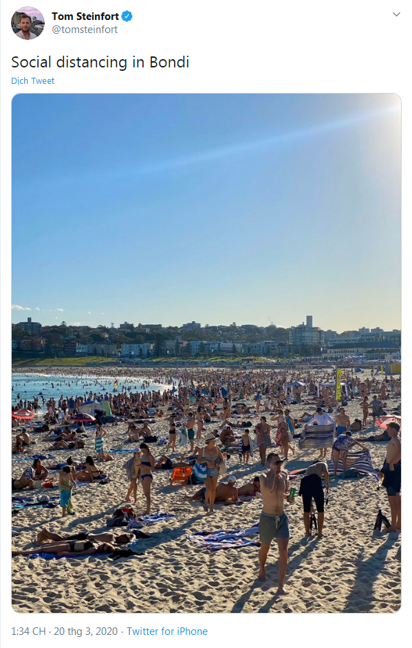 Các “Covidiots” tụ tập trên bãi biển tại bãi biển Bondi, thành phố Sydney, tiểu bang New South Wales, nước Úc. Ảnh: Tom Steinfort/Twitter.