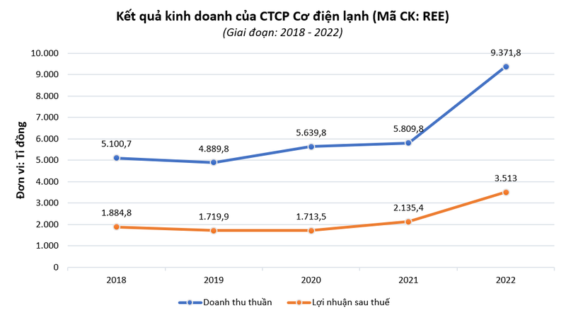 Lũy kế cả năm 2022, doanh thu thuần và lợi nhuận sau thuế của REE đạt lần lượt 9.371,8 tỉ đồng và 3.513 tỉ đồng, tăng lần lượt 61% và 65% so với thực hiện năm 2021, đồng thời vượt lần lượt 1% và 70% so với kế hoạch.