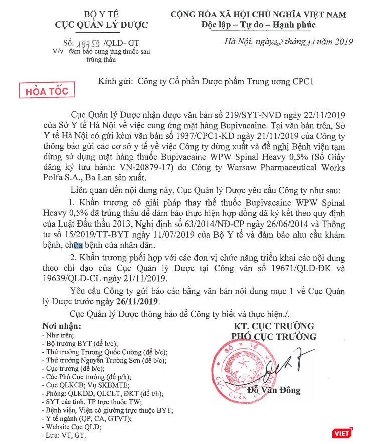 Cục Quản lý Dược đề nghị Công ty Cổ phần Dược phẩm Trung ương CPC1 khẩn trương có giải pháp thay thế thuốc Bupivacaine WPW Spinal Heavy 0,5% đã trúng thầu, để đảm bảo thực hiện hợp đồng đã ký kết theo quy định của Luật Đấu thầu 2013, Nghị định của Chính phủ và Thông tư của Bộ Y tế, để đảm bảo nhu cầu khám, chữa bệnh cho người dân.