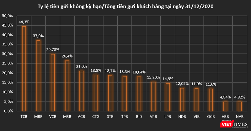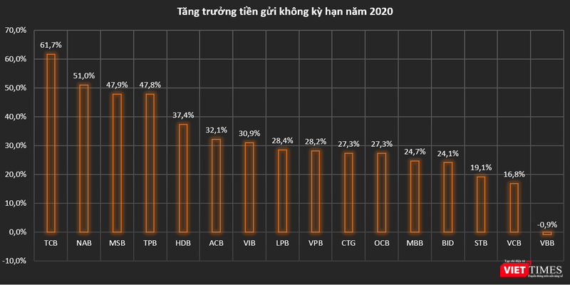 Techcombank vẫn dẫn đầu ở tiêu chí này, với tốc độ tăng trưởng tiền gửi không kỳ hạn ở mức 61,7%. Những cái tên tiếp theo trong danh sách khảo sát của VietTimes cũng gây nhiều bất ngờ như NamABank (51%), MSB (47,9%) và TPB (47,8%).