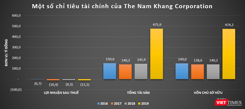 Dữ liệu của VietTimes cho thấy, dòng vốn đổ vào doanh nghiệp dự án The Nam Khang Resort Residences diễn ra mạnh vào năm 2019. Cụ thể, tính đến ngày 31/12/2019, quy mô tổng tài sản và vốn chủ sở hữu của The Nam Khang Corporation lần lượt đạt 475,9 tỉ đồng và 474,2 tỉ đồng, cao gấp 3,26 lần và 3,38 lần so với cuối năm 2018.