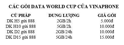 Theo hướng dẫn của VinaPhone, để đăng ký các gói cước Data 3G/4G dành cho mùa World Cup kể trên, thuê bao di động VinaPhone chỉ cần soạn DK [Tên gói] gửi 888 (ví dụ DK H5 gửi 888). Các gói theo giờ H5 và H10 sẽ ngừng truy cập khi hết thời lượng gói giúp người dùng chủ động kiểm soát chi phí. Các gói ngày D2 và D15 được tính năng tự động gia hạn, tiện lợi cho khách hàng sử dụng thường xuyên. Trong trường hợp không cần gia hạn, người dùng có thể soạn HUY [Tên gói] gửi tới đầu số 888 để hủy gói (888 là đầu số tin nhắn miễn phí).