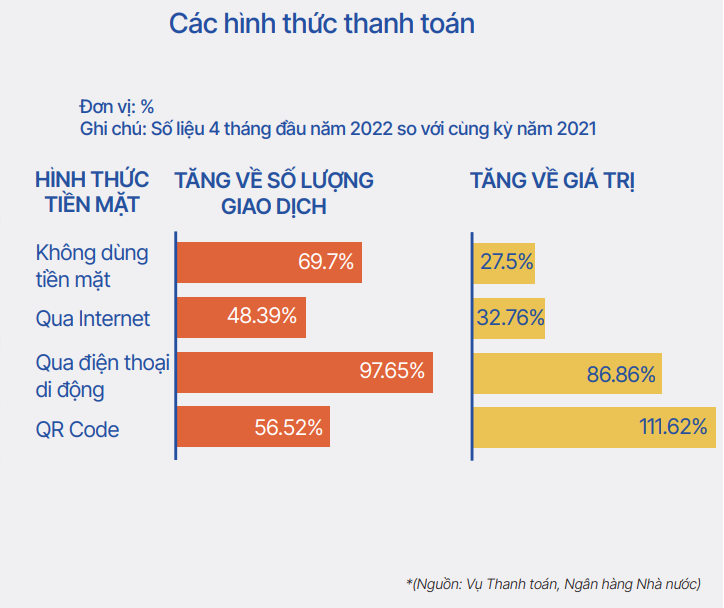 Thanh toán không tiền mặt trở nên ngày càng phổ biến tại Việt Nam. Theo Hiệp hội Ngân hàng Việt Nam (VNBA), các giao dịch rút tiền mặt qua ATM đã giảm mạnh từ 26% năm 2020 xuống mức 12% vào tháng 4/2022. Trong khi đó, các giao dịch không dùng tiền mặt tăng 69,7% về số lượng và tăng 27,5% về giá trị so với cùng kỳ.
