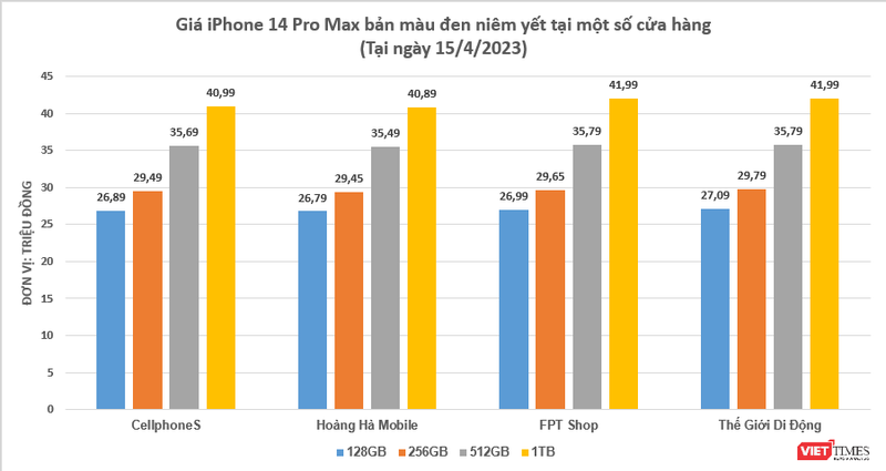 Cụ thể, hệ thống cửa hàng Hoàng Hà Mobile đang niêm yết giá iPhone 14 Pro Max thấp nhất, ở mức 26,79 triệu đồng cho phiên bản 128GB. Sau đó là chuỗi cửa hàng CellphoneS với mức giá niêm yết là 26,89 triệu đồng, tại FPT Shop là 26,99 triệu đồng và tại Thegioididong là 27,09 triệu đồng.